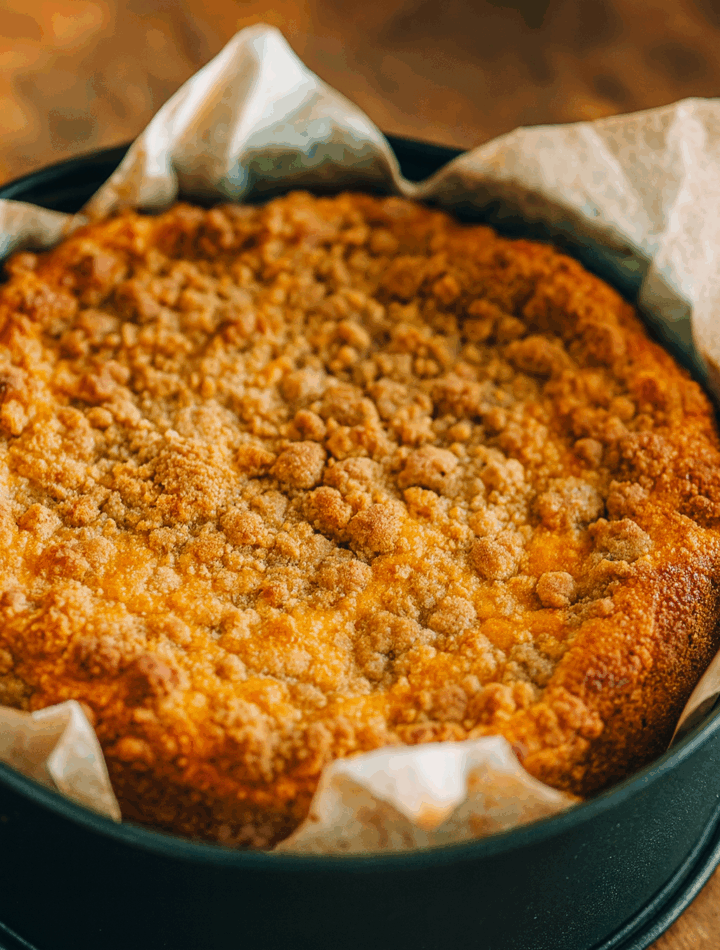 A creamy, cozy pumpkin cheesecake topped with a crunchy, golden crumble.